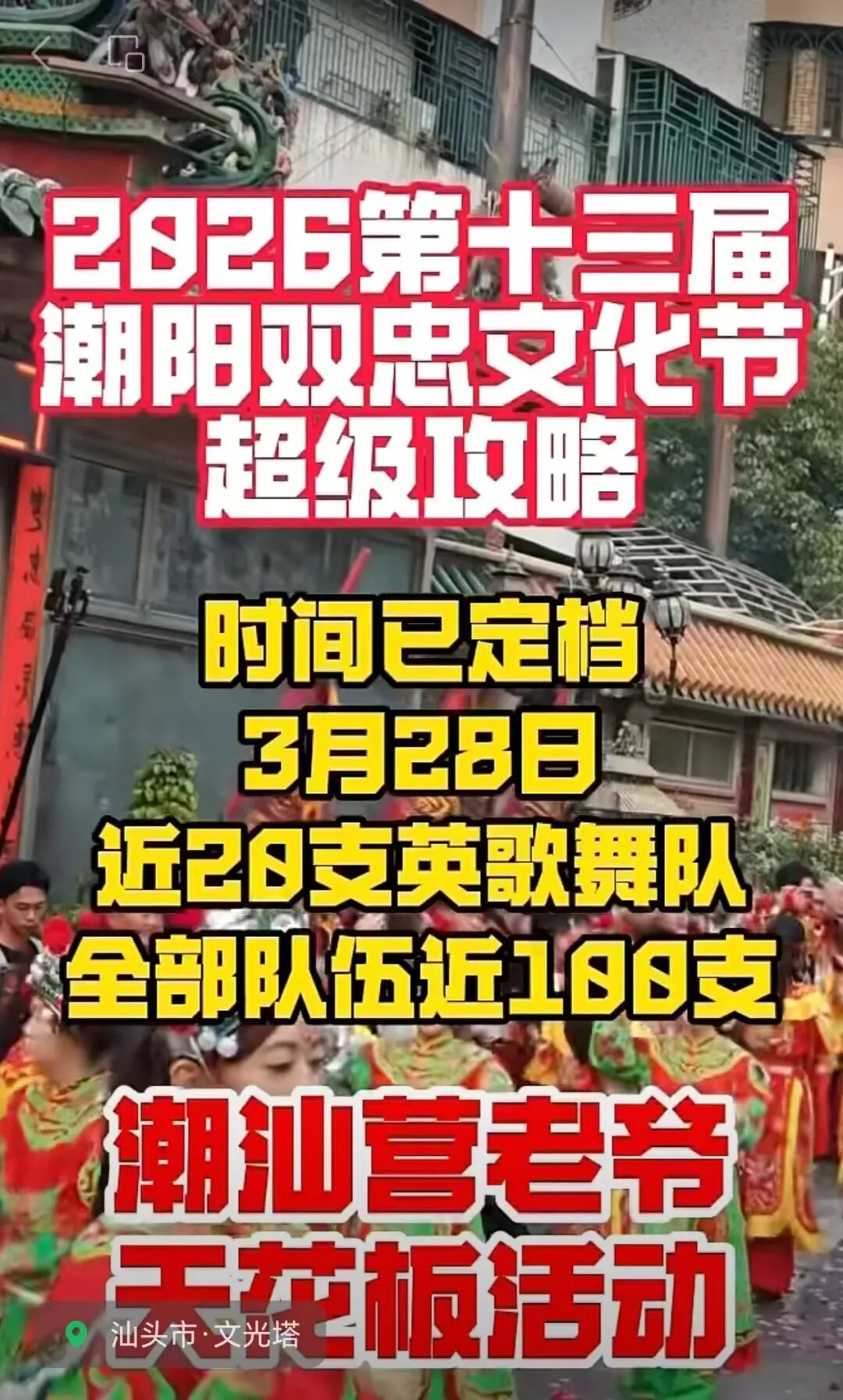 汕头潮阳区双忠文化节—万人巡游展现千年古县魅力,游行队伍场面壮观,锣鼓英歌浩浩荡荡,堪称潮汕最大型的营老爷。3月28日,第十三届双忠文化节将会惊艳到您。