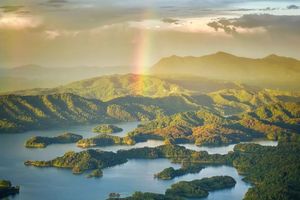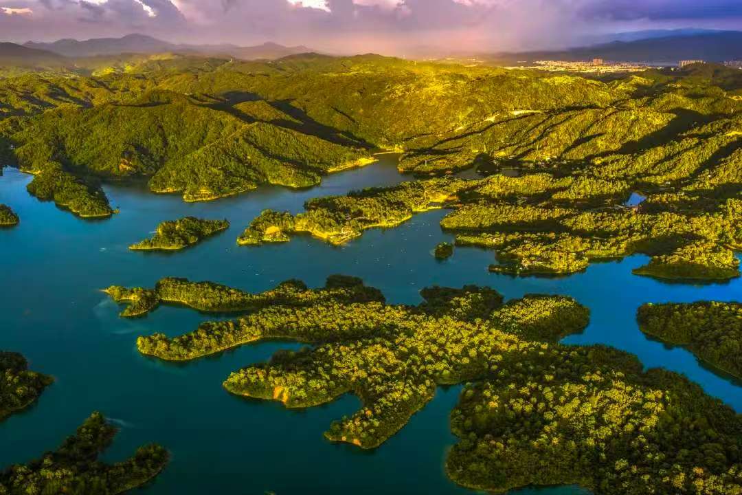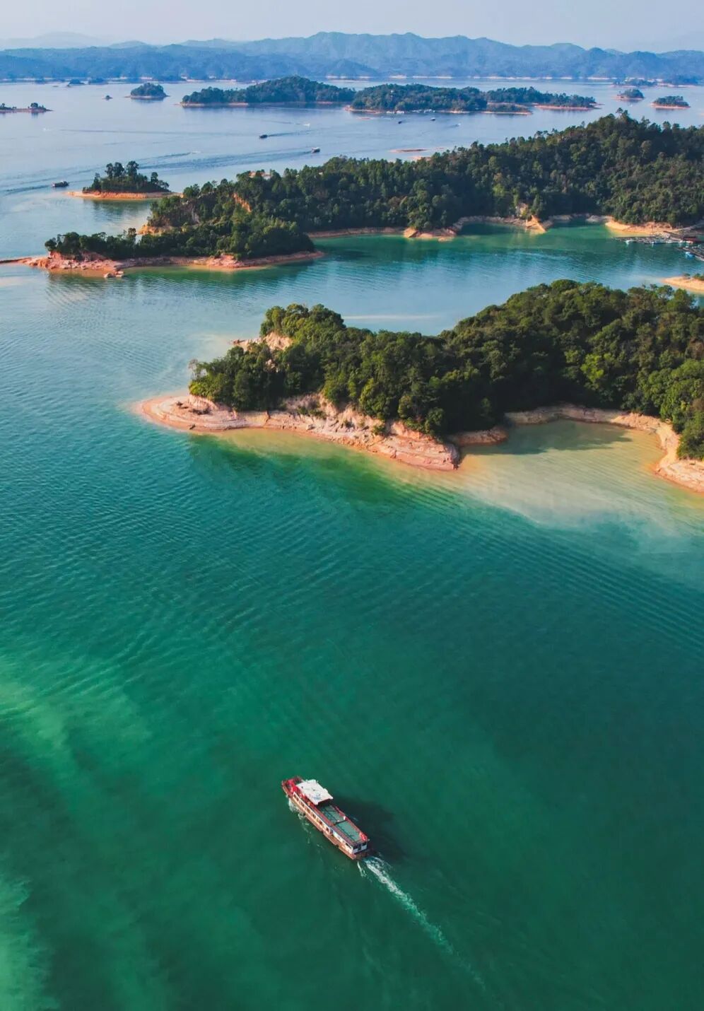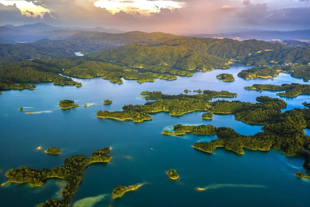 三百八十多个岛屿如翡翠散落湖中,近处的苍翠欲滴,渐远的化作青黛色剪影,最远的只剩水墨般的淡痕。游船划开金色水路,岛与岛之间形成光的回廊。