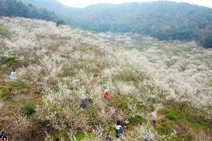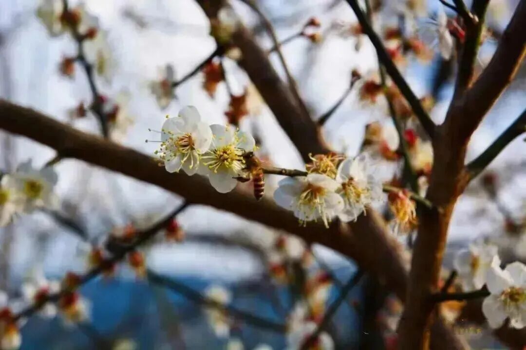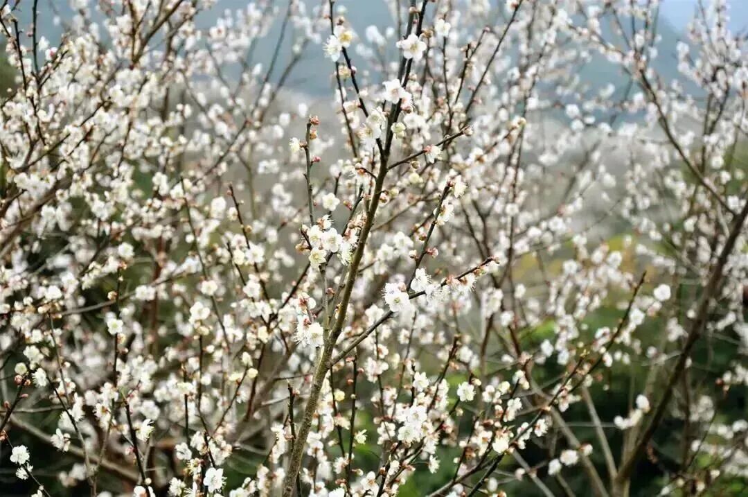 如今,这漫山遍野的梅树已渐入佳境。从远处看,梅花似一片雪海,风吹飘香。从近处看,花儿争艳,蜂儿翻飞,如诗如画,非常适合到这里写生、摄影甚至拍婚纱照。